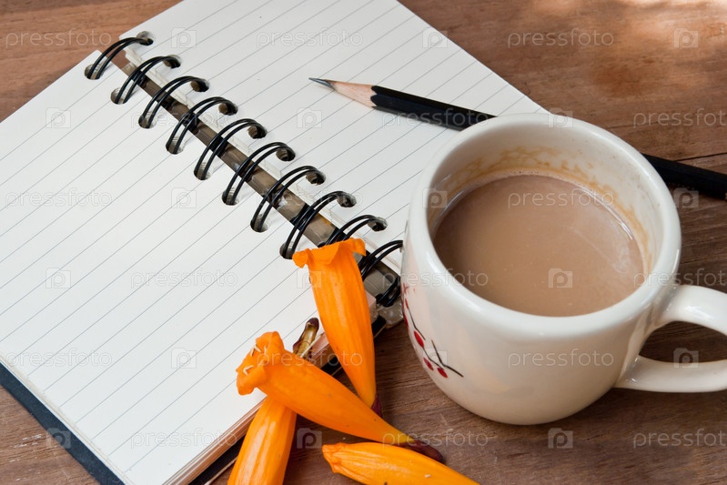 Чашка горячего кофе, цветок и блокнот