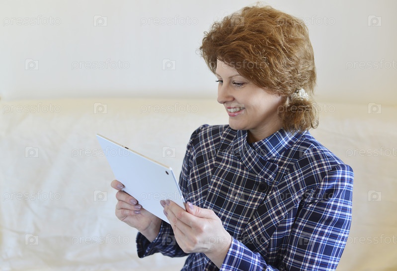 Позитивные женщина с планшетом, сидя на диване