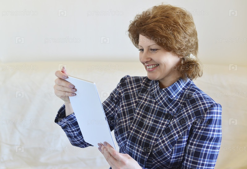 Позитивные женщина с планшетом, сидя на диване