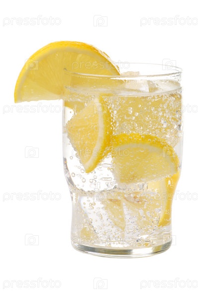 Стеклянный стакан с шипучей водой, кусочками льда и лимона, изолированный на белом фоне