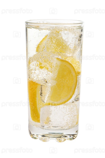 Стеклянный стакан с шипучей водой, кусочками льда и лимона, изолированный на белом фоне