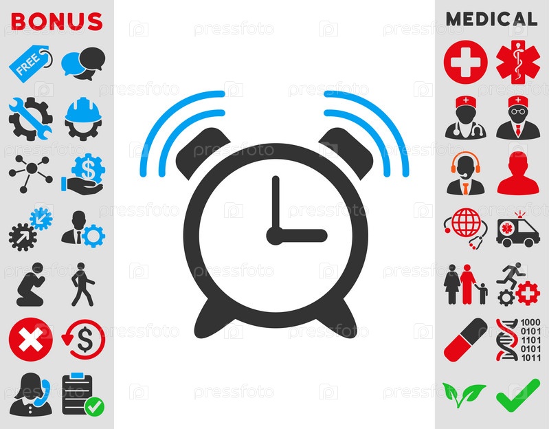 Иллюстрация значок будильника кольцо. Стиль является биколор плоский символ, голубой и серый цвета, закругленные углы, белый фон