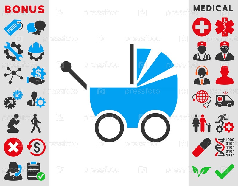 Детские коляски иллюстрации значок. Стиль является биколор плоский символ, голубой и серый цвета, закругленные углы, белый фон