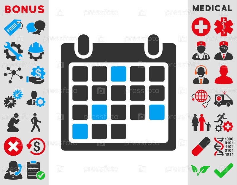 Иконка Календарь назначения иллюстрации. Стиль является биколор плоский символ, голубой и серый цвета, закругленные углы, белый фон