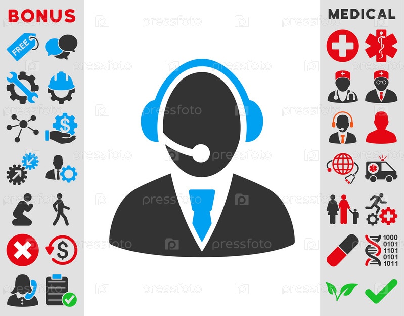 Центр звонков работник иллюстрации значок. Стиль является биколор плоский символ, голубой и серый цвета, закругленные углы, белый фон