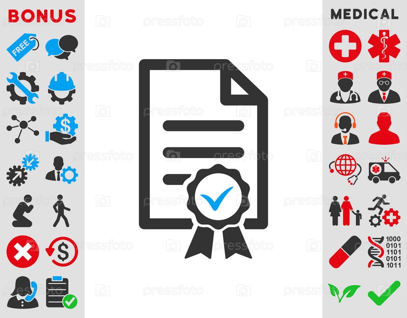 Сертифицированные иллюстрации значок. Стиль является биколор плоский символ, голубой и серый цвета, закругленные углы, белый фон