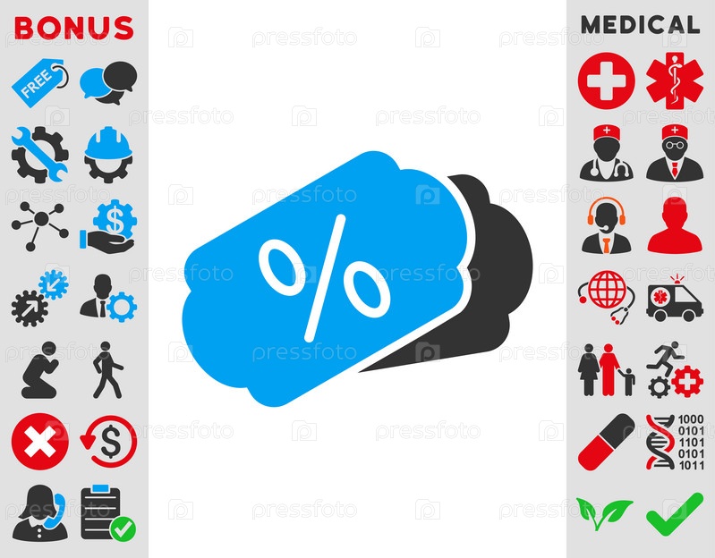 Скидка купоны иллюстрации значок. Стиль является биколор плоский символ, голубой и серый цвета, закругленные углы, белый фон