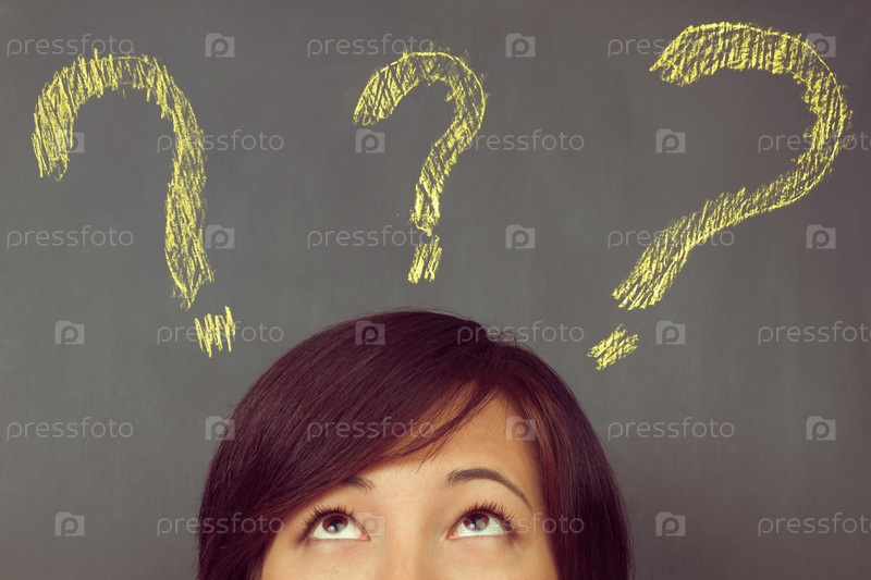 Женщина смотрит на вопросительные знаки