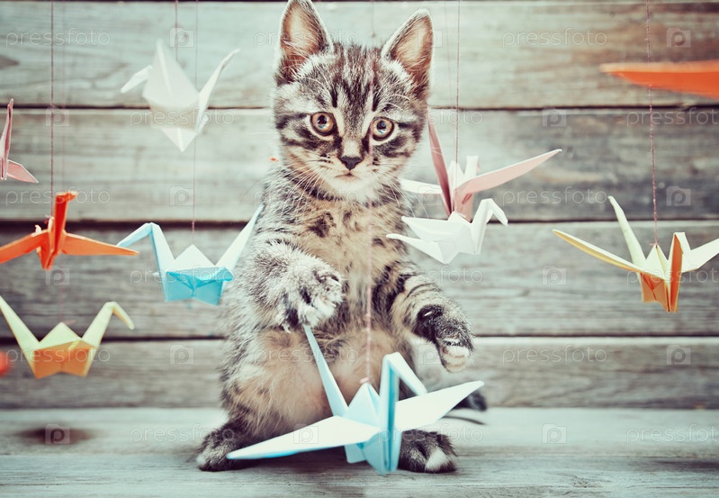 Котенок играет с бумажных журавликов