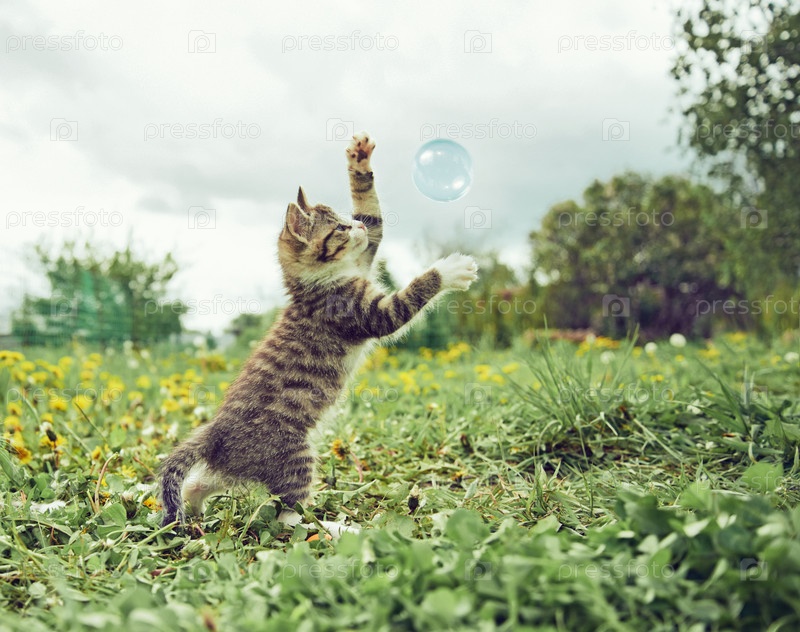 Котенок играет с мыльный пузырь