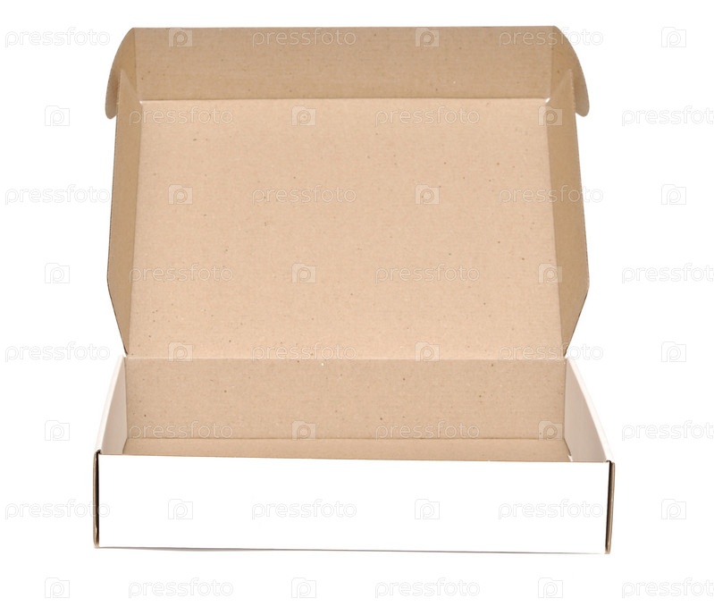 Открытая картонная коробка на белом фоне