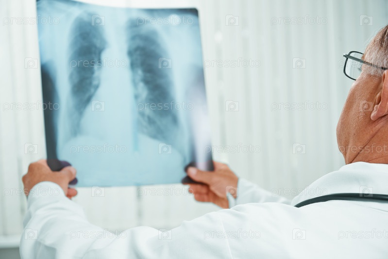 Врач осматривает рентгеновское изображение легких