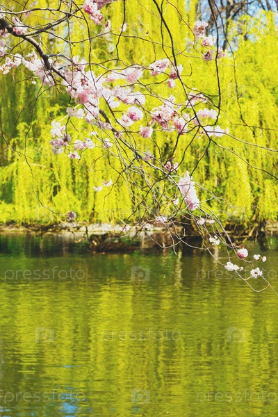 Прекрасный пруд и ветви цветущего дерева