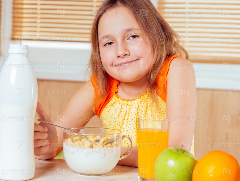 Счастливая девушка ест завтрак