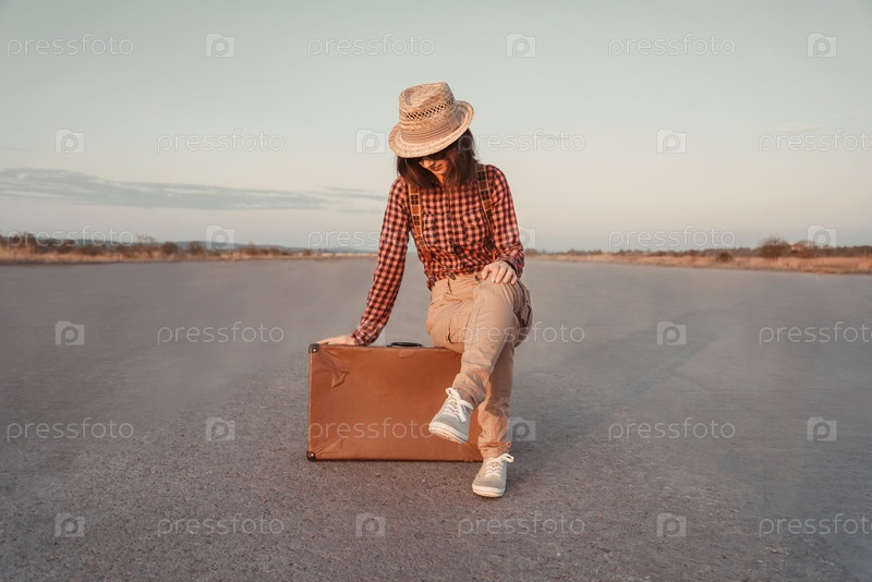 Туристический сидит на чемодан