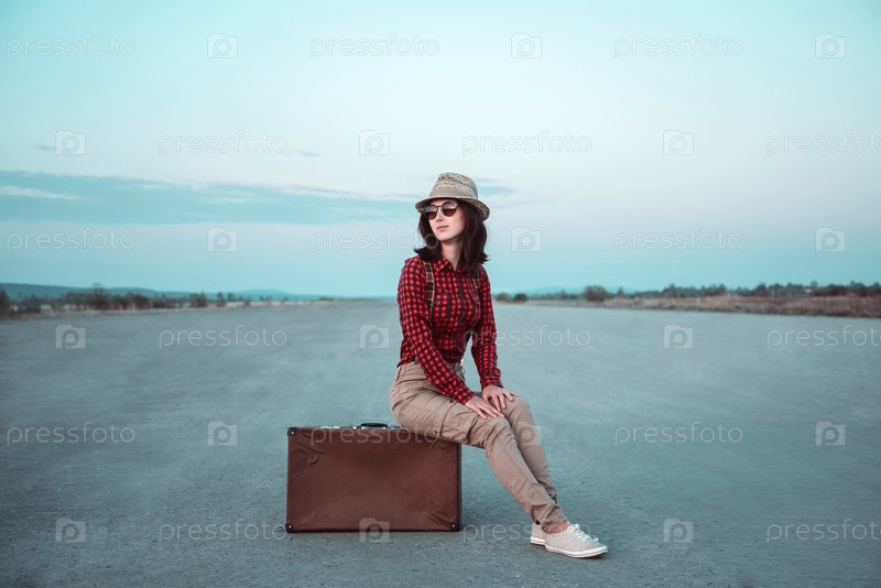 Молодая женщина сидит на ретро чемодан