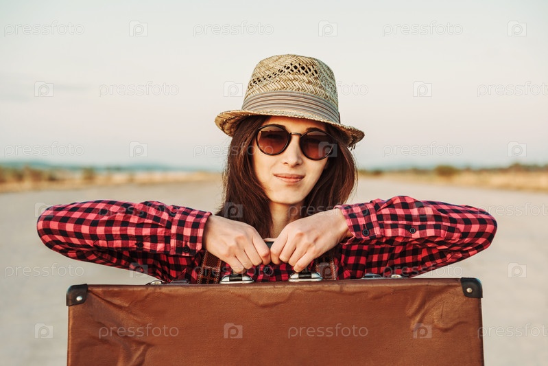 Путешественник женщина держит чемодан
