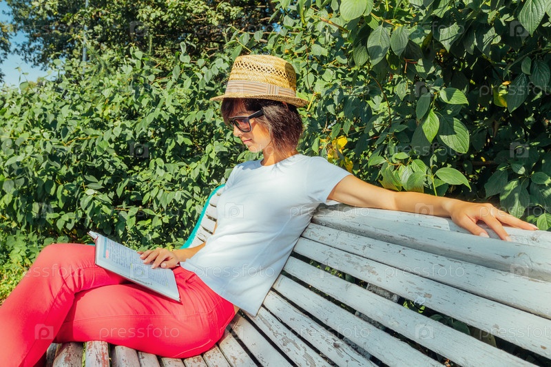 Женщина читает книги на скамейке