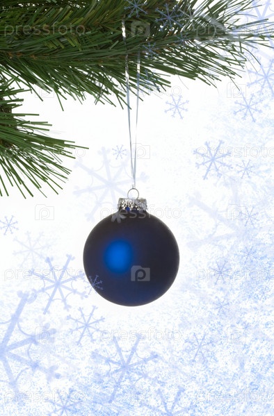 Изображение голубого декоративного игрушечного мяча, висящего на ветке елены и окруженного снежинками