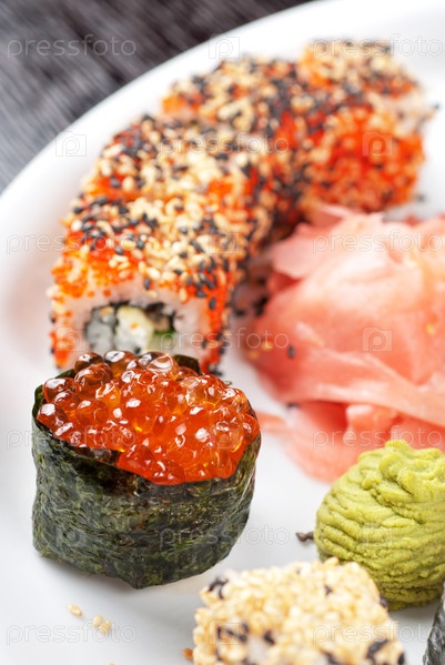 Суши и красная икра, крупный план