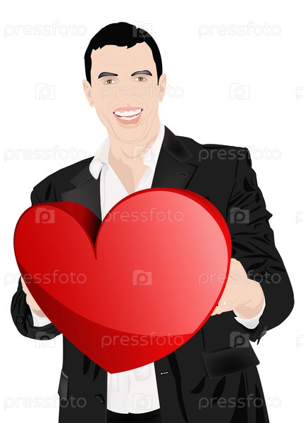 Изображение радостного мужчины с красным сердцем в руках на белом фоне