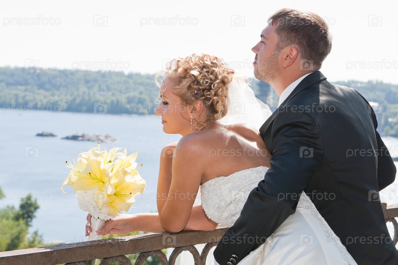 Жених с красивой невестой на мосту