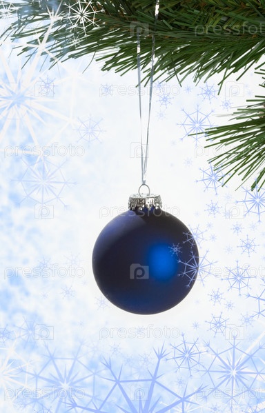 Близкий план синего игрушечного мяча на ветке еловой елки на рождественском фоне