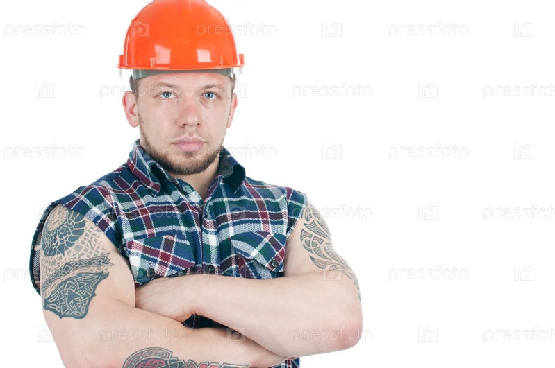 Портрет серьезного мужчины-строителя в рубашке без рукавов и защитной каске, белый фон