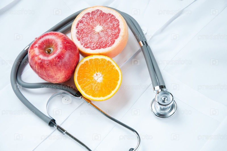 Свежие фрукты и стетоскоп на медицинском халате