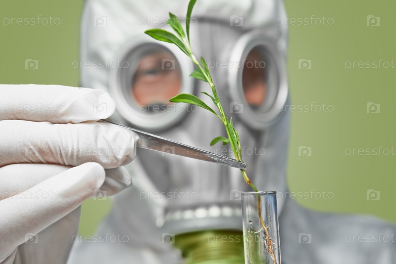 Ученый в респираторе ставит зеленое растение в колбу