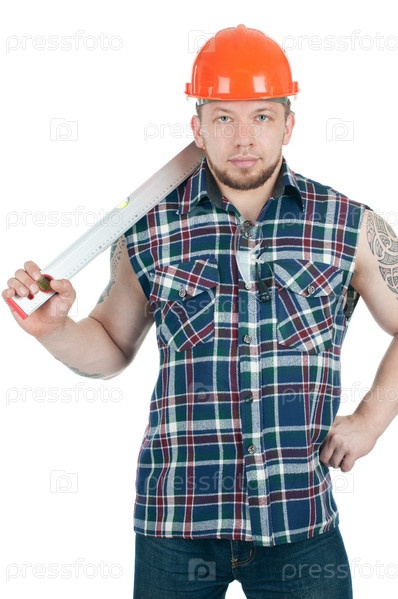 Мужчина-строитель в защитной каске с уровнем в руке на белом фоне
