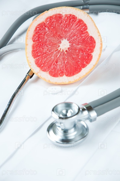 Крупным планом половинка свежего грейпфрута и стетоскоп на медицинском халате
