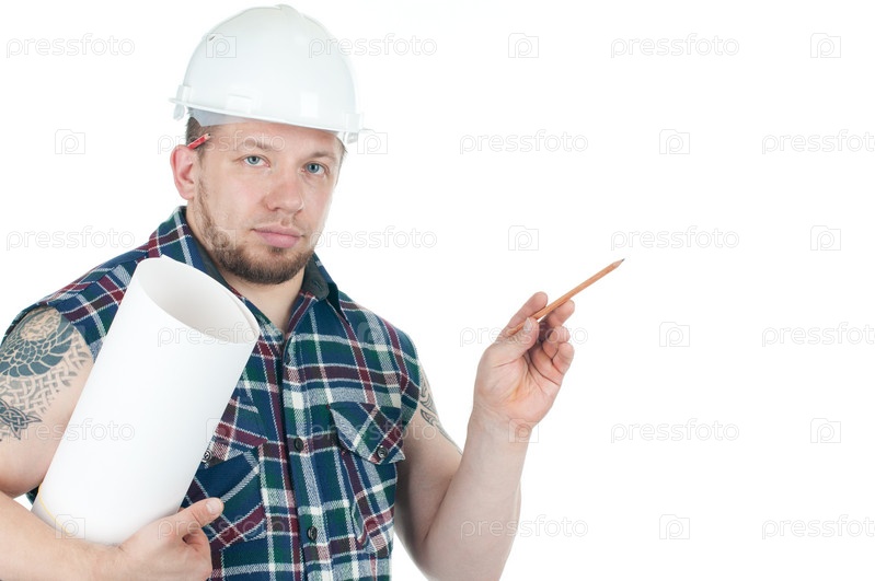 Уверенный строитель с чертежами и карандашом в руках, белый фон, место для текста