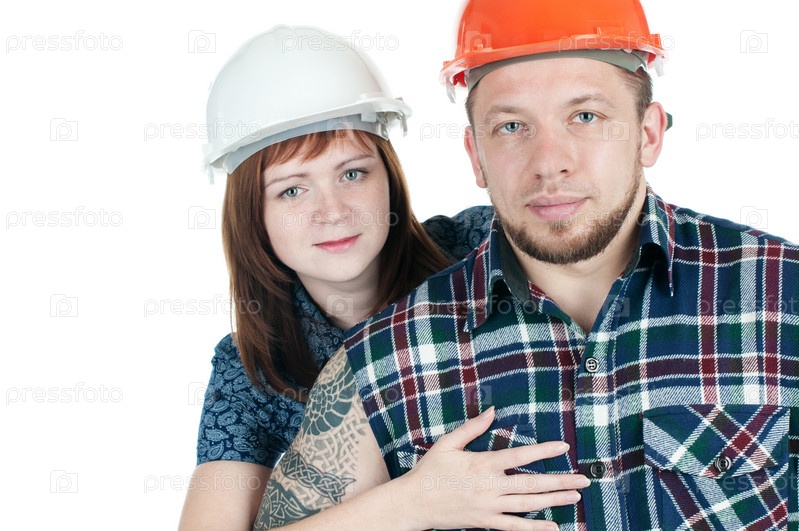 Молодая пара в строительных касках, изолированная на белом фоне