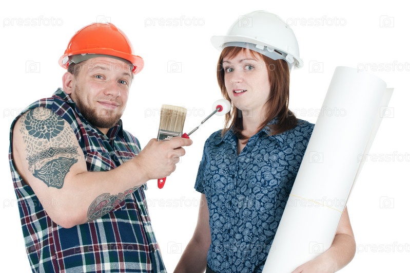 Забавные мужчина-строитель с инструментами и девушка-архитектор с чертежами