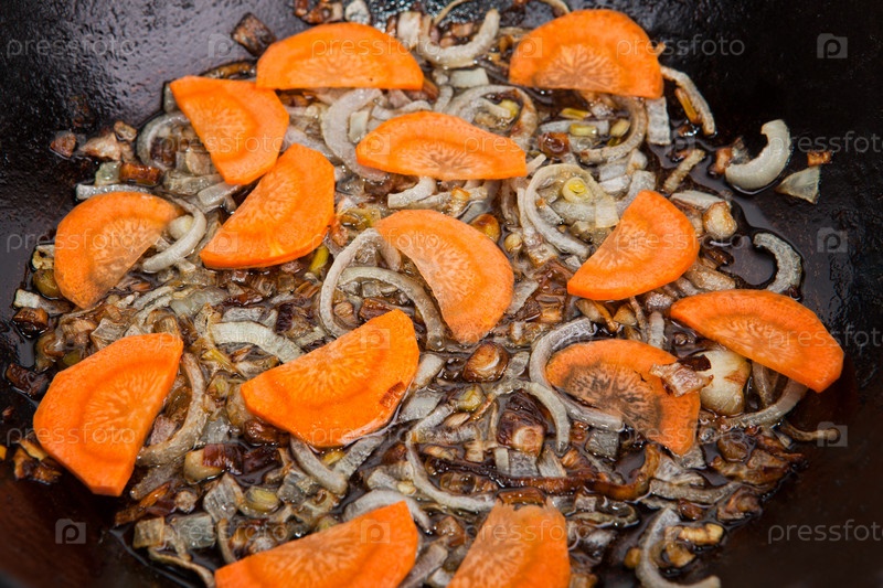 Кусочки моркови и лука на сковороде крупным планом