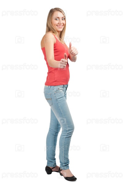 Красивая девушка в повседневной одежде держит большие пальцы обеих рук поднятыми вверх