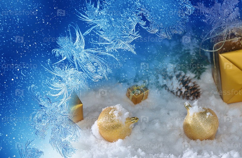 Рождественские подарочные коробки, игрушки и елочная ветка на снегу