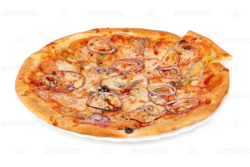 Пицца на блюде, белый фон
