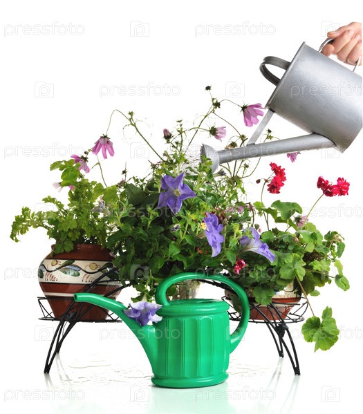 Полив комнатных цветов, изолировано на белом фоне