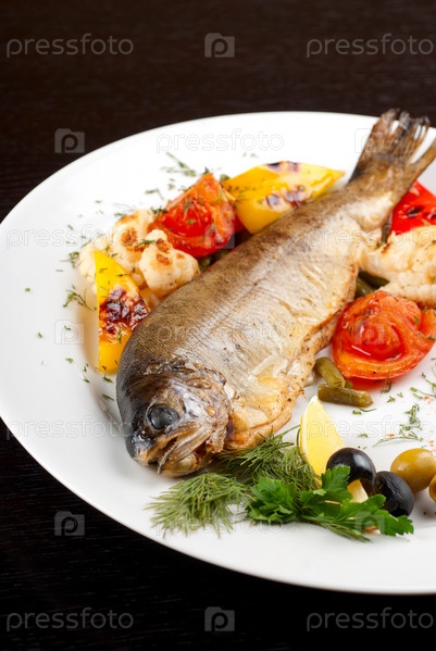 Запеченная форель с овощным гарниром на тарелке