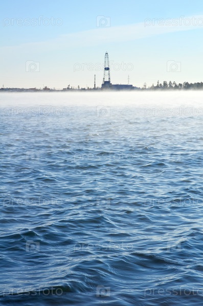 Озеро морозным утром с нефтяной вышкой на горизонте