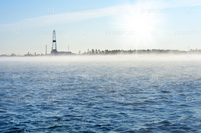 Озеро морозным утром с нефтяной вышкой на горизонте