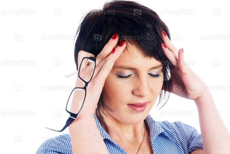 Молодая красивая женщина с очками в руках держится за голову так, как будто та у нее болит