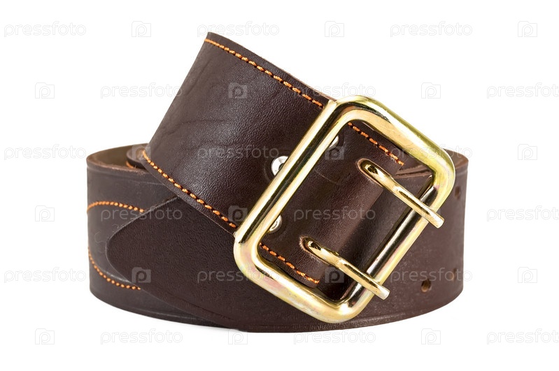 Коричневый кожаный ремень с металлической пряжкой на белом фоне