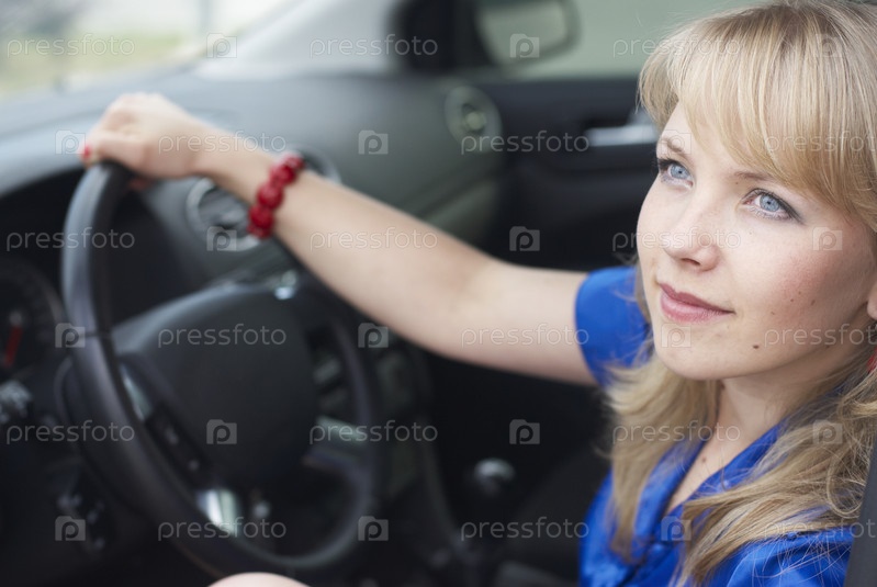 Молодая женщина сидит в машине на парковке