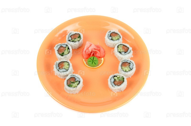 Роллы, имбирь и васаби на тарелке, белый фон