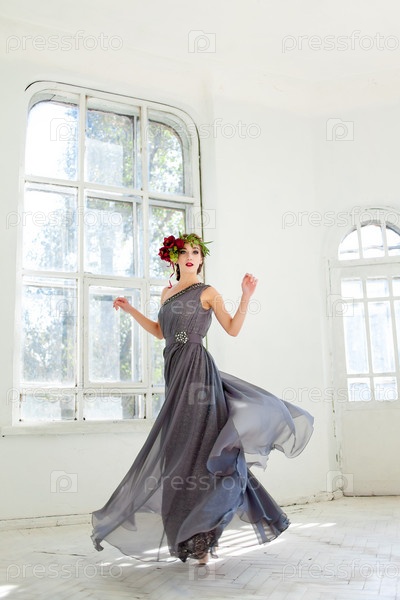 Красивая балерина танцует в длинном платье