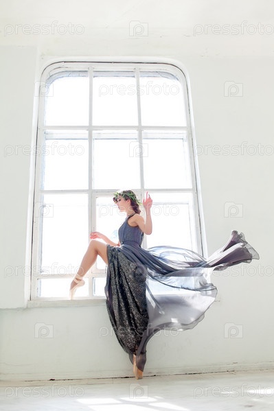 Красивая балерина танцует в длинном платье