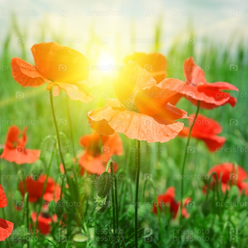 Поле маков в лучах солнца
